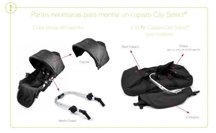 - IMPORTANTE: Para montar un capazo se necesita disponer de un asiento City Select, pues utiliza parte de su chasis y el toldo.