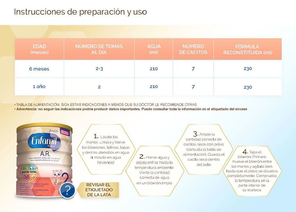 5. Una vez preparada, la fórmula puede estropearse rápidamente. Debe consumirse inmediatamente después de la preparación o tapar y almacenar en frigorífico entre 2-4 °C un máximo de 24 horas. No congele la fórmula preparada. No consuma la fórmula preparada si ha estado fuera del frigorífico durante 2 horas o más. Una vez comenzada la alimentación al bebé consumir la fórmula en 1 hora, no refrigerar en ese tiempo y tirar el sobrante limpiando perfectamente el biberón y los utensilios utilizados.