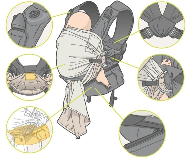 Manduca Duo incluye un reposacabezas integrado de tela elástica para sostener mejor la cabecita del bebé o para cuando se queda dormido. Se incluye también un manual gráfico de instrucciones en 8 idiomas.