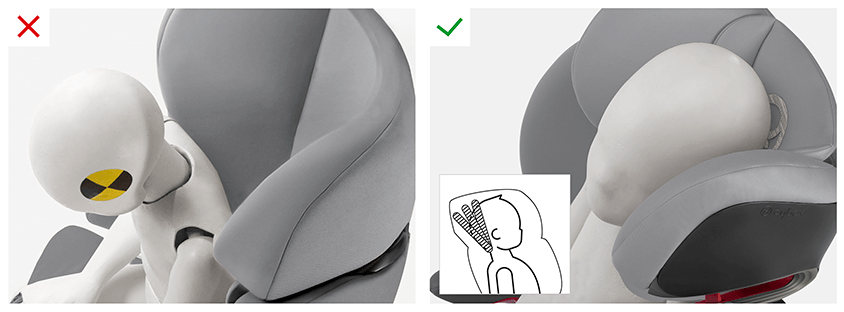 - El reposacabezas reclinable optimizado previene que la cabeza del niño caiga hacia delante cuando se queda dormido. Esto asegura que, en caso de impacto lateral, la cabeza se mantiene siempre en la zona de seguridad, proporcionando una protección máxima.